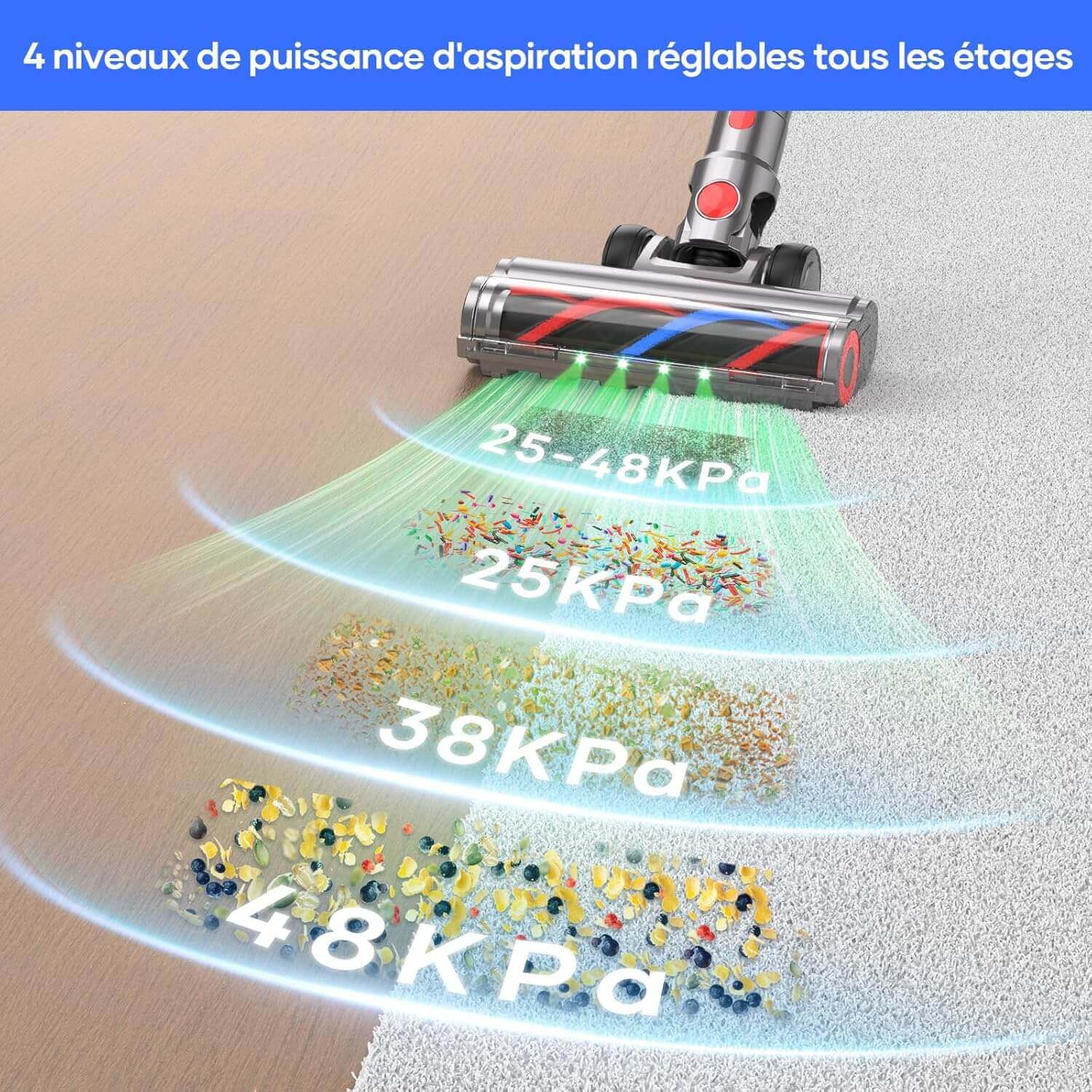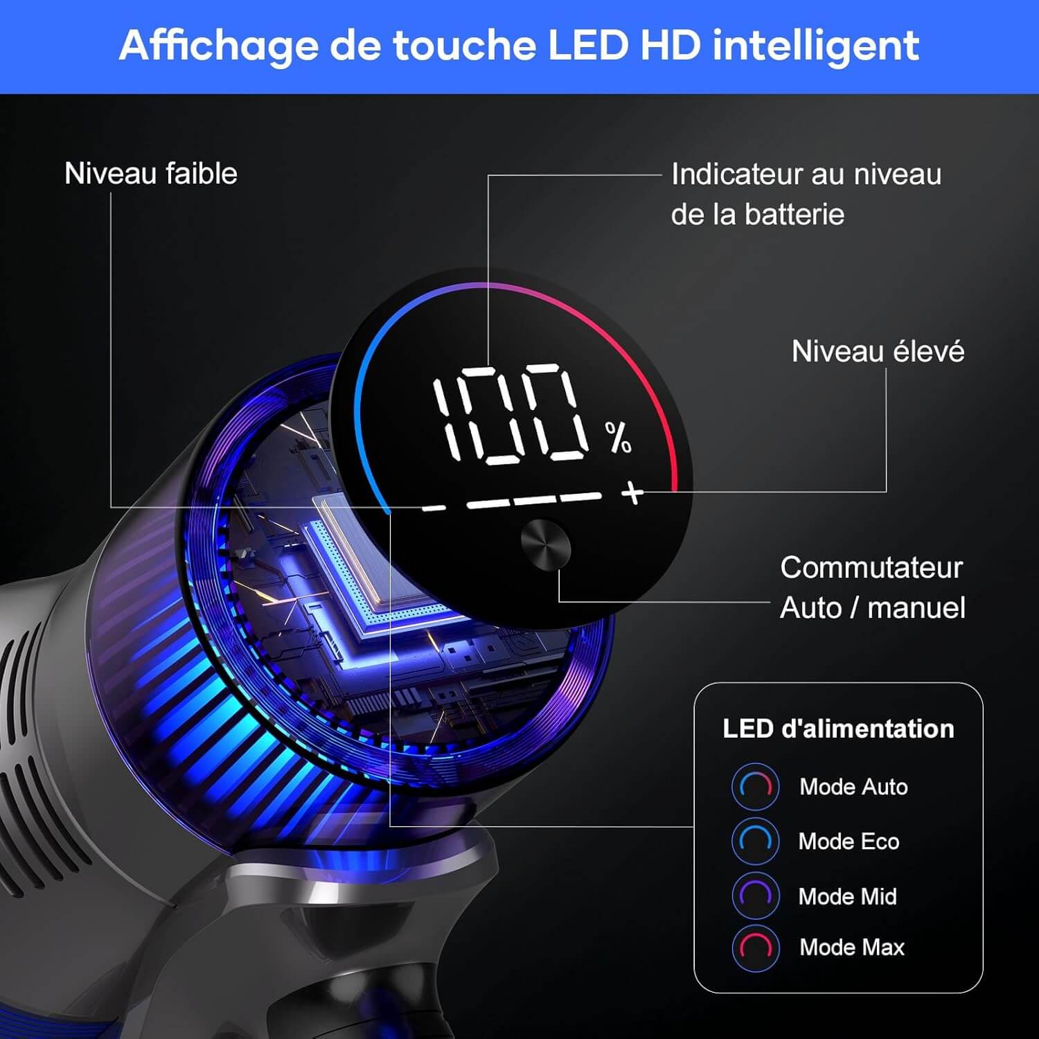 - OLED -Touchscreen: OLED -Bildschirm auf dem akku-staubsauger zeigt Batterie- und Wartungswarnungen an, sodass Sie über den Vakuumlaufstatus auf dem Laufenden bleiben können. 4 Saugmodi mit 4 LED-Power-Leuchten: Auto-Modus mit Sensorlicht (25-48 kPa ≈ 20-70 min), ECO-Modus mit blauem Licht (25 kPa ≈ 70 min), Standardmodus mit lila Licht (38 kPa ≈ 40 min), Max-Modus mit Red Light (48 kPa ≈ 20 min).