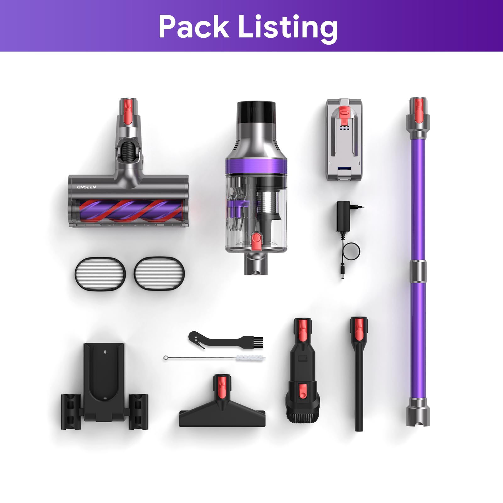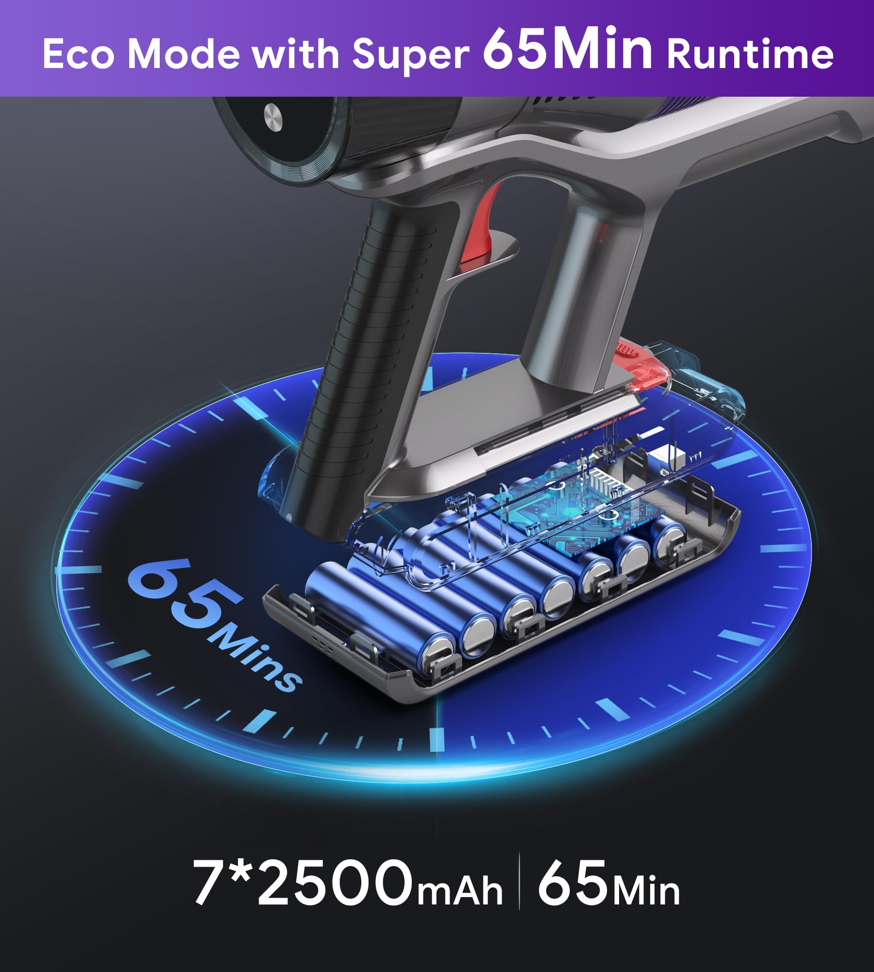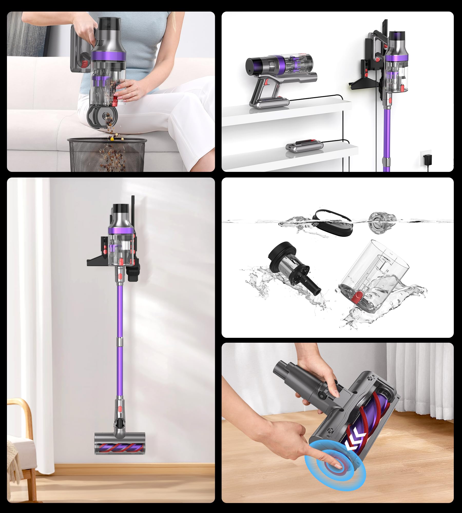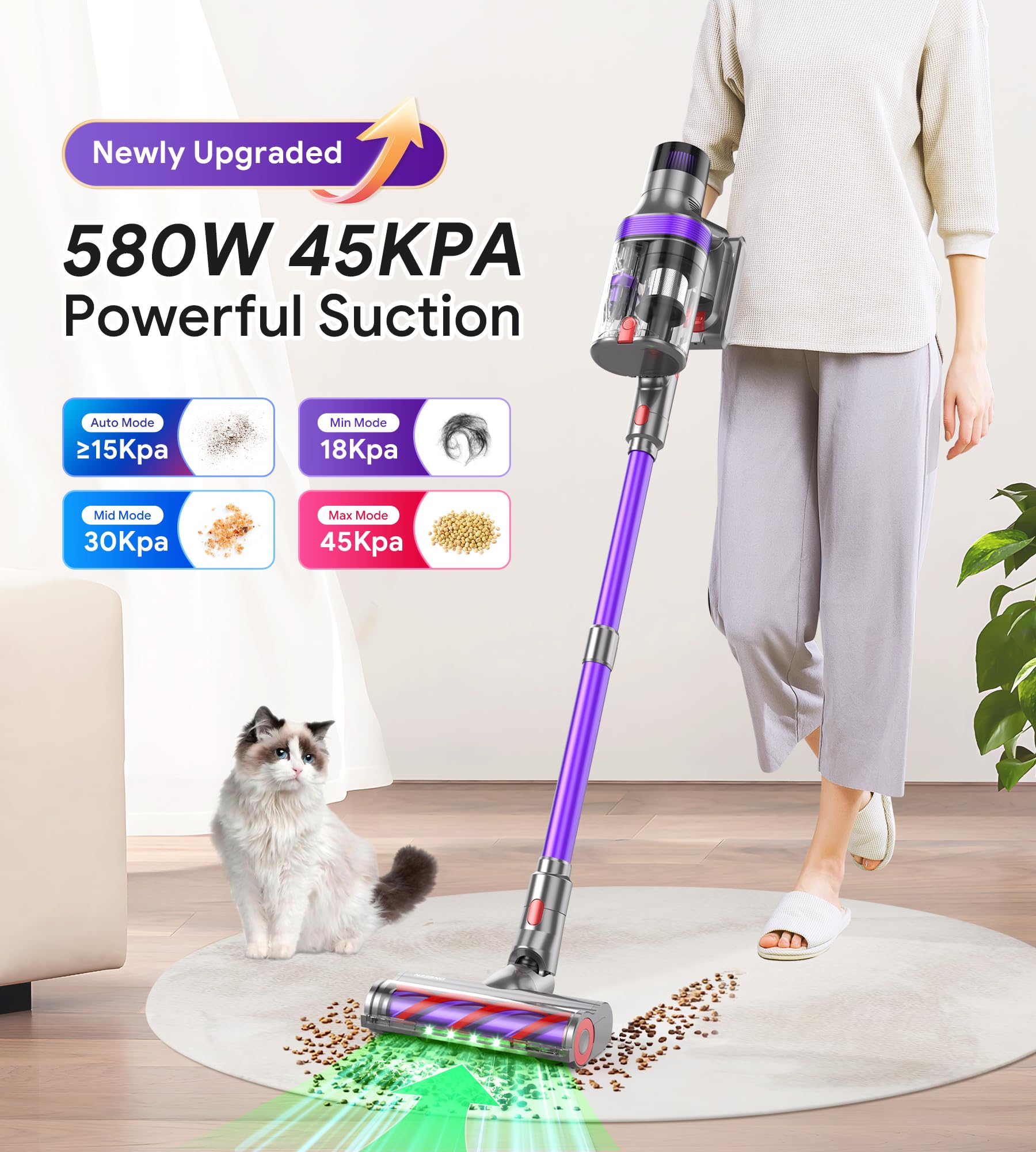 - 45Kpa Powerful Suction & 580W Upgraded Brushless Motor: The Cordless Stick Vacuum Cleaner is equipped with the latest upgraded brushless motor, which can provide 580W power, ensuring an unprecedented suction power up to 45Kpa. Easily and effectively removes dirt, snack crumbs, pet hair even on long-pile carpets