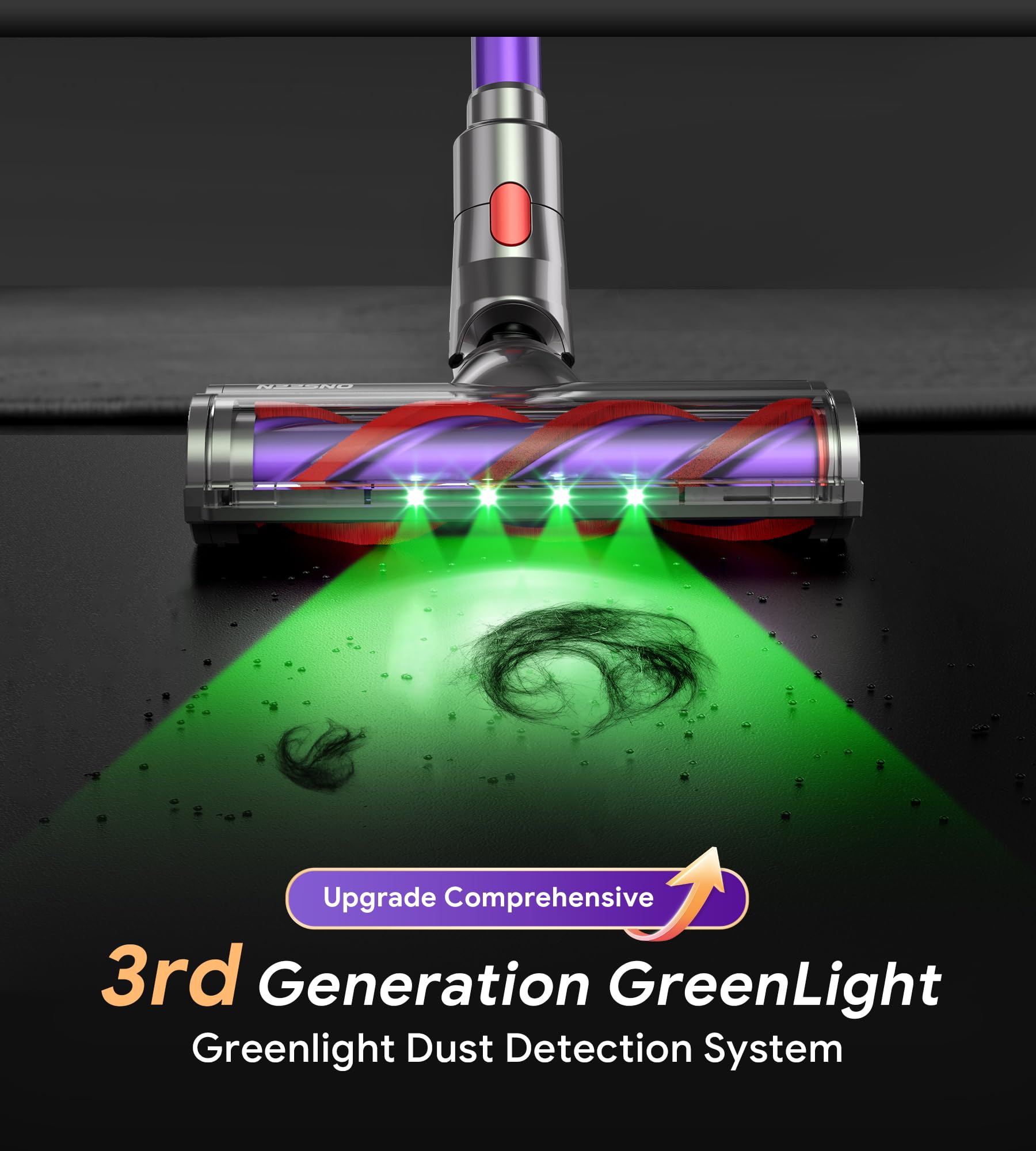 - Rotating Brush Head with 4 Green LED Lights: The 4 green led headlights of vacuum cleaners for home can illuminate furniture in dark corners. Clean your home with ease with the flexible 180° swivel side to side and 90° up and down. Compared with white led, the green led can effectively map particles as small as 0.1um due to the scattering property of green light on dust
