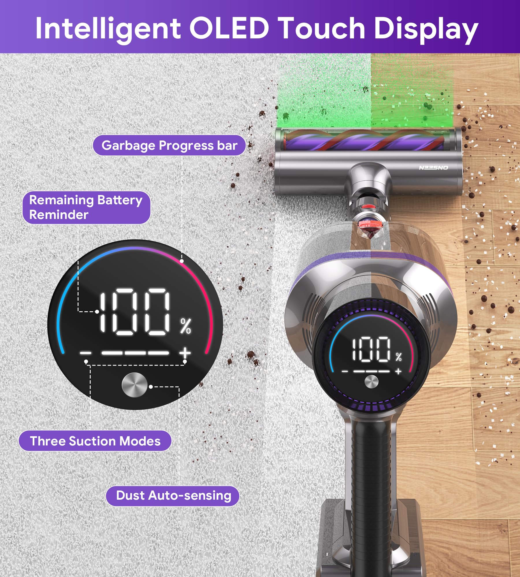 - OLED Smart Panel: The stick vacuum built-in sensor, you can track the remaining battery power and the operating status of the vacuum cleaner via the OLED panel. When the roller brush/host is blocked, the OLED panel emits a red alarm to remind you. By pressing the "+/-" button, you can change the cleaning mode. (Eco/Standard/Boost/Extreme)